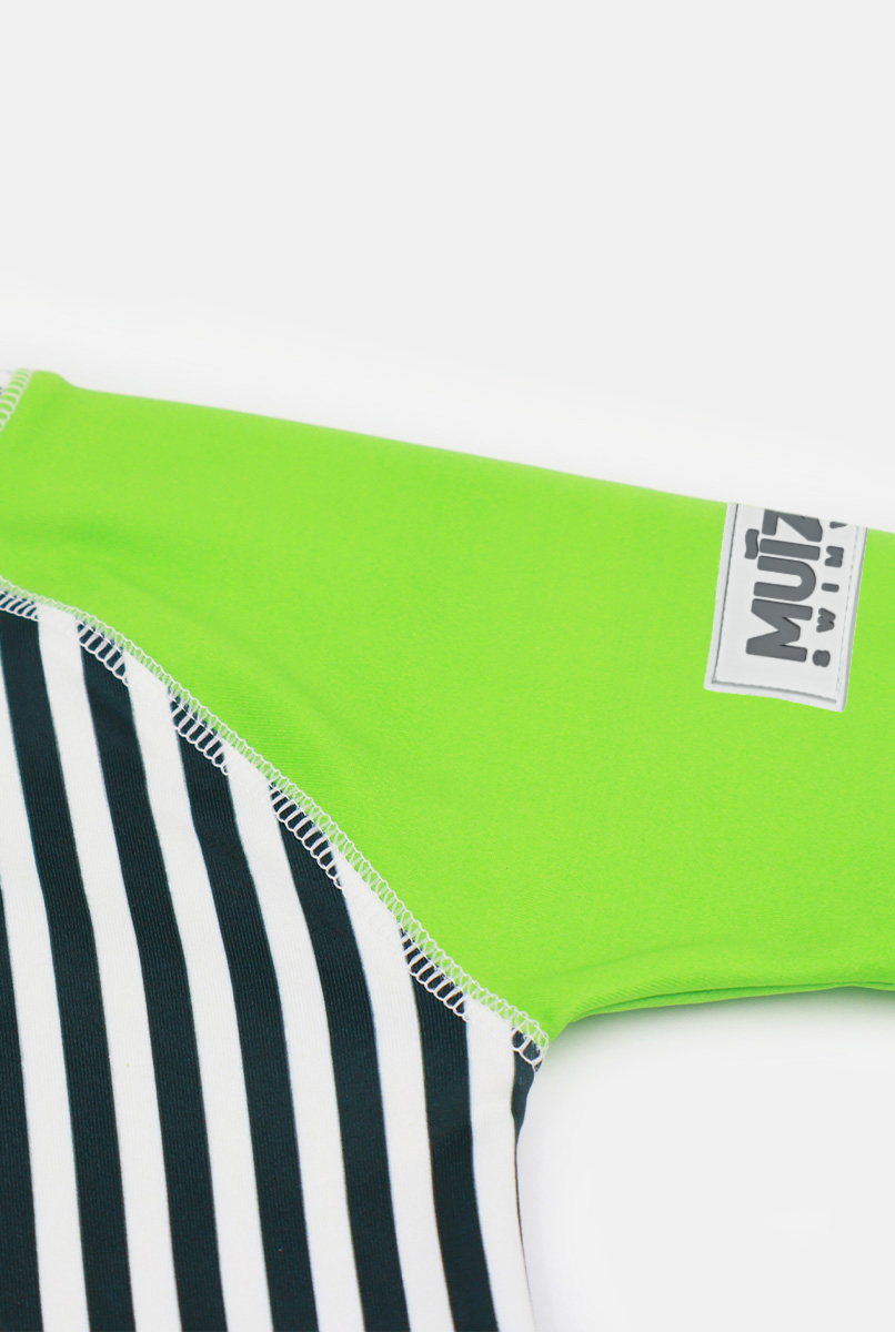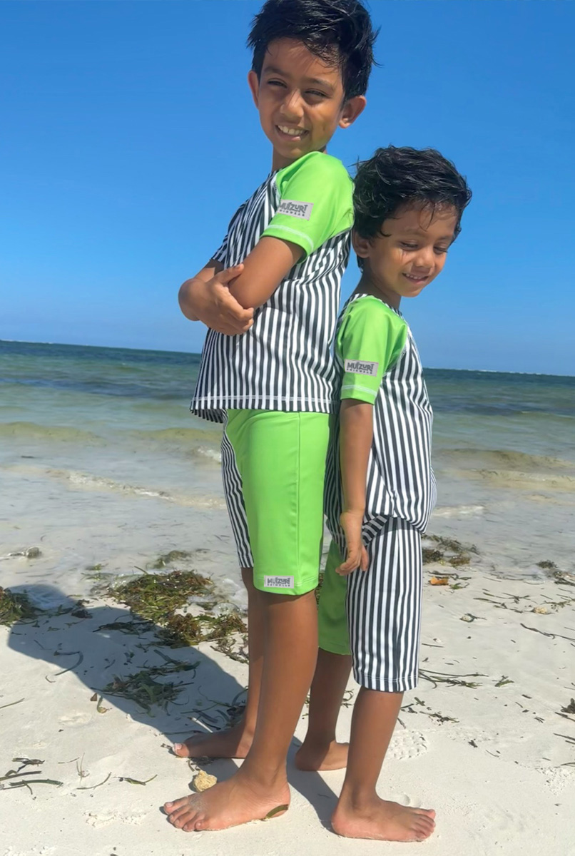 The lush, green landscape that Africa has to offer and the marvellous Zebra we know and love from the animation Madagascar inspired us to create Marty. Marty offers a matching set that comes with a short-sleeve rash tee and a pair of jammers. Designed with safety in mind, The Signal—our signature, reversible tee with its vibrant, one-of-a-kind ‘life-saver’ sleeve—makes it easy to spot your little one from afar. Because every adventure should come with peace of mind.