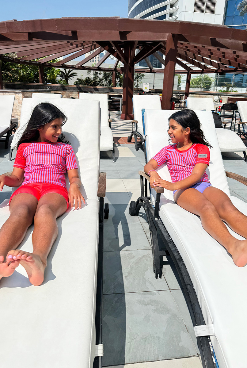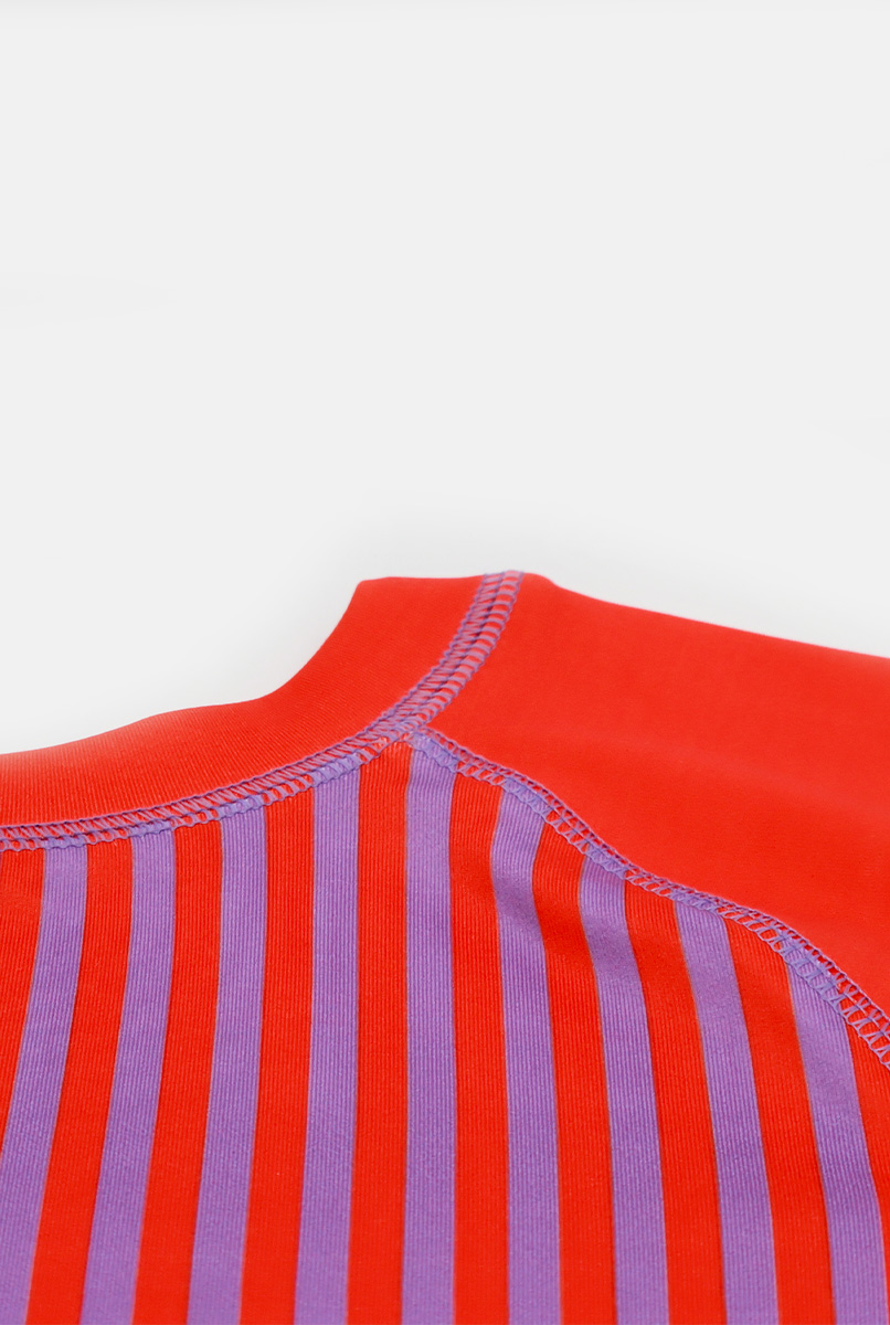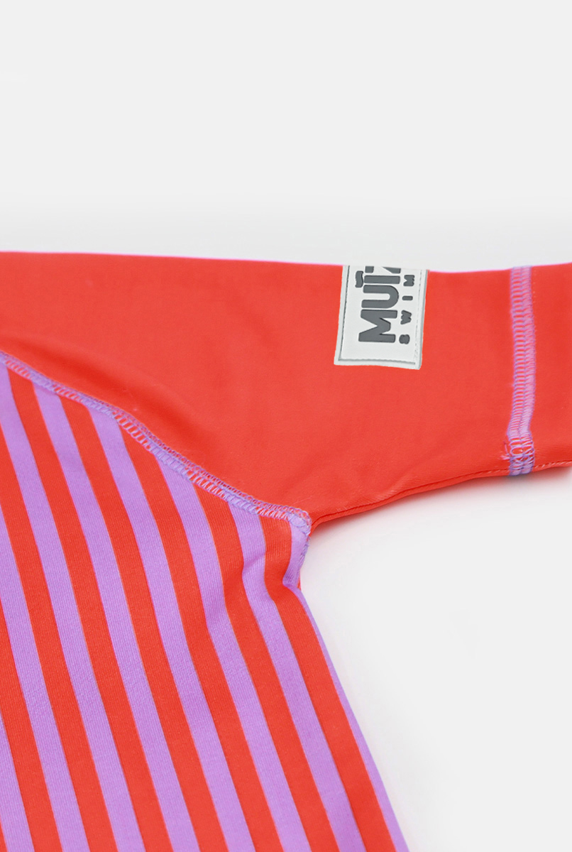 Inspired by the royals of today, the bold red and purple of Diana exude a majestic yet confident vibe. Diana offers a matching set that gives versatility and convenience of having a short sleeve rast tee and two styles of bottomwear: hotpants and a bikini—perfect for whatever mood she’s in! Designed with safety in mind, The Signal—our signature, reversible tee with its vibrant, one-of-a-kind ‘life-saver’ sleeve—makes it easy to spot your little one from afar. Because every adventure should come with peace of mind.